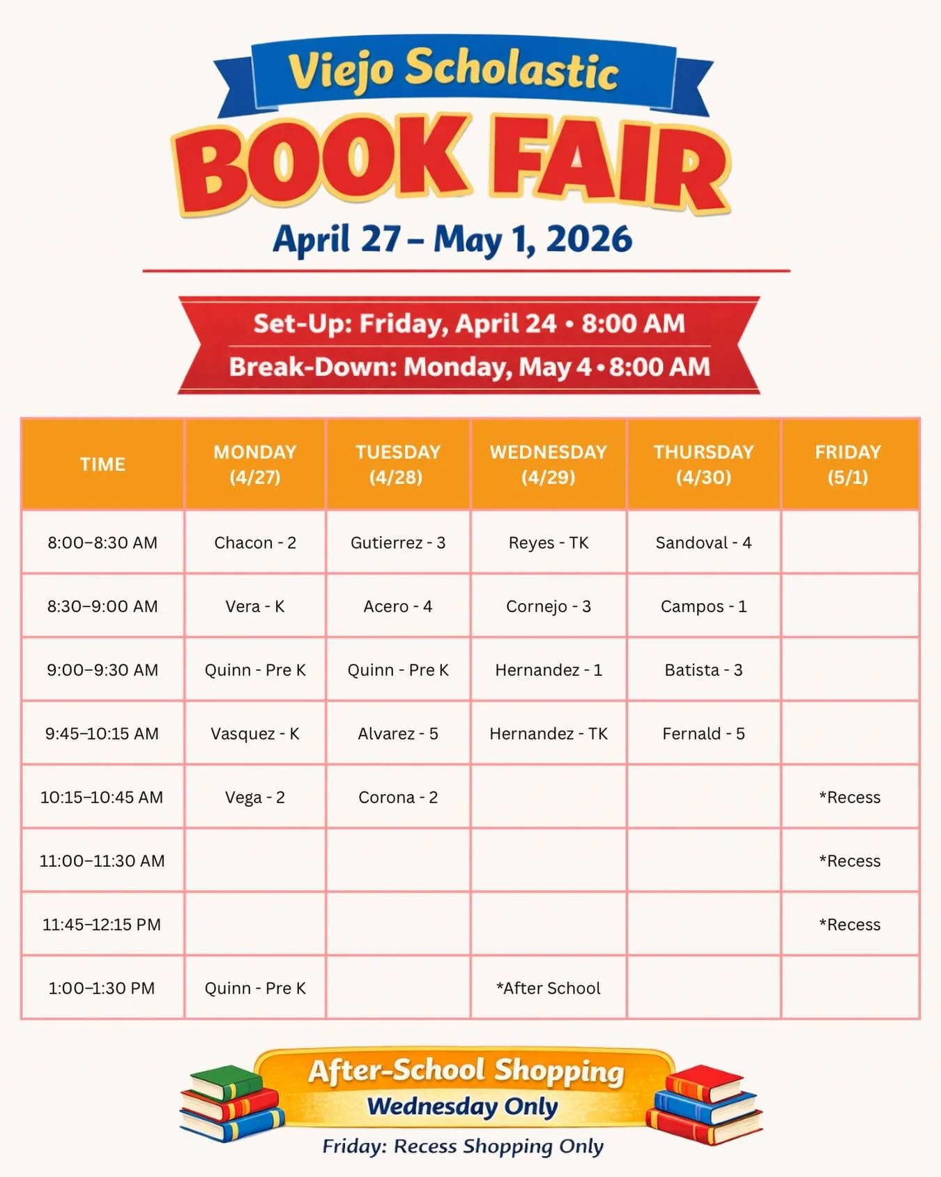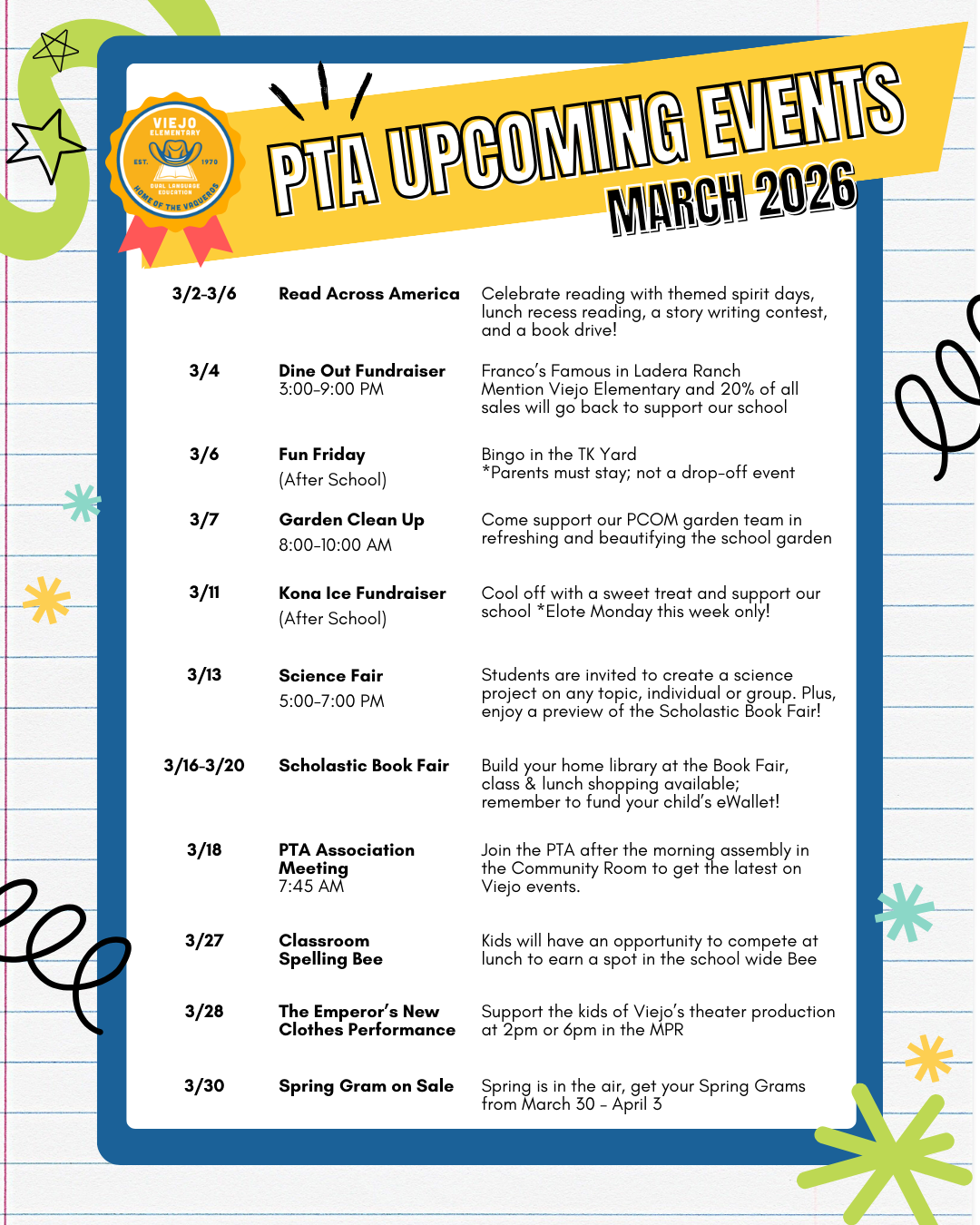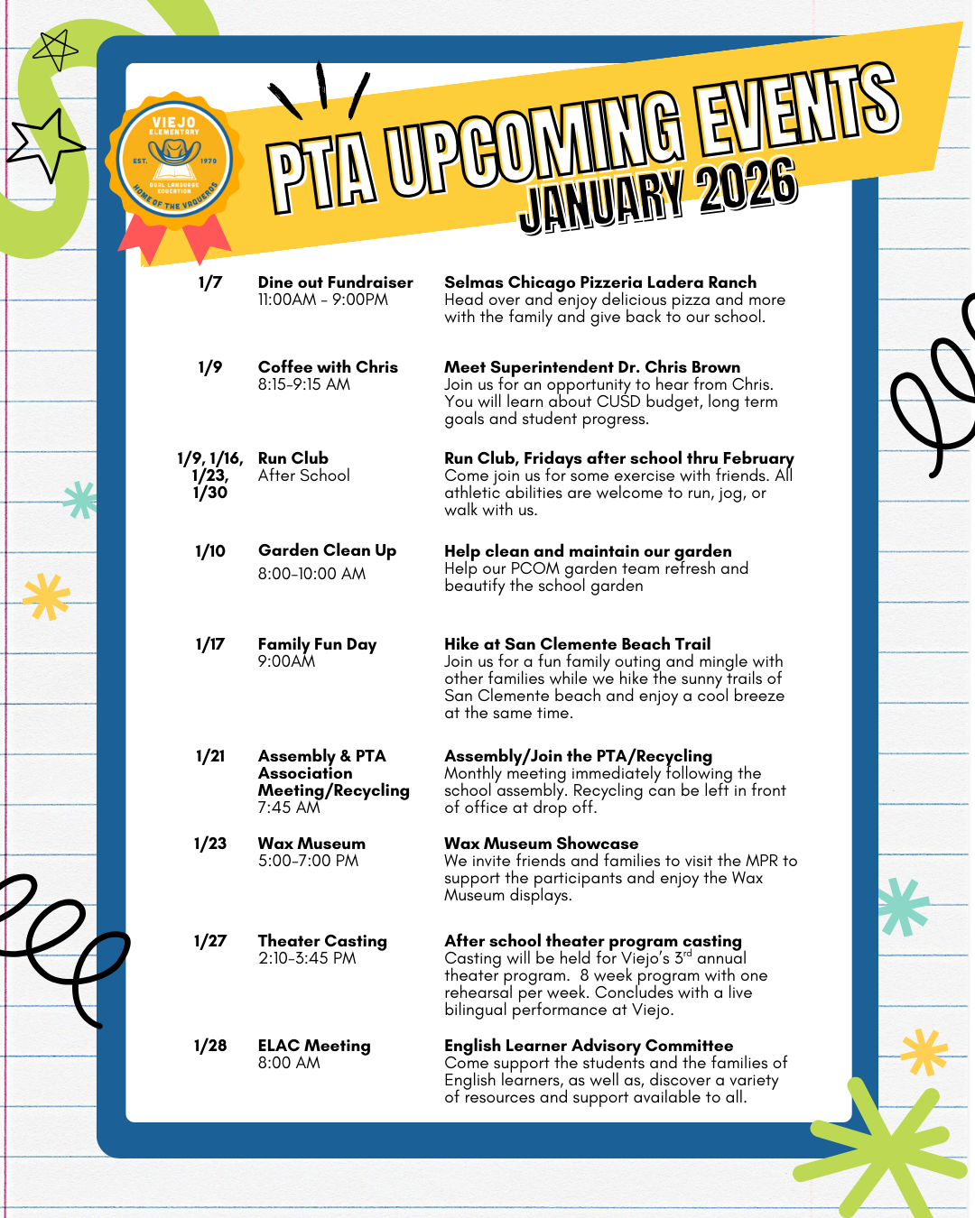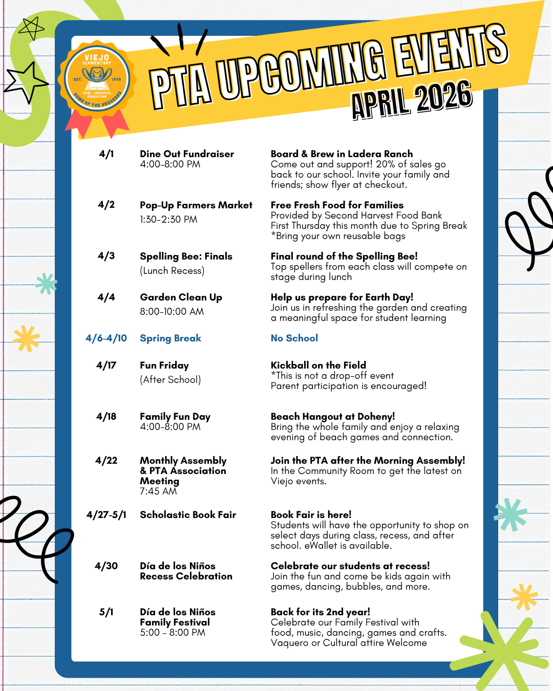 Our website offers translation through Google Translate for your convenience. Please note that translations are generated automatically and may not always be accurate. The Viejo Elementary PTA has no control over the quality or accuracy of these translations. For the most reliable information, please refer to the original English version of the website.