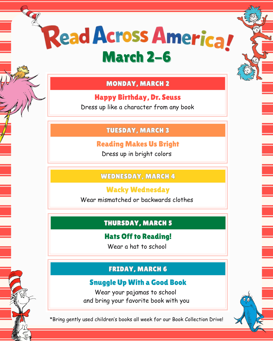 Originally created to encourage children to read and celebrate literacy, Read Across America has grown into a nationwide event recognizing the joy of books and the power of reading to spark imagination and learning. Join us as we celebrate diverse stories, authors, and readers throughout our school!